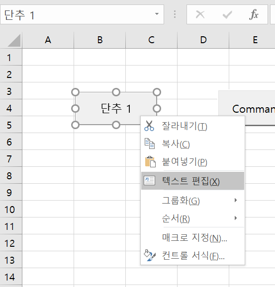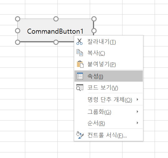 디자인모드 > 버튼에서 우클릭 > 컨트롤 서식