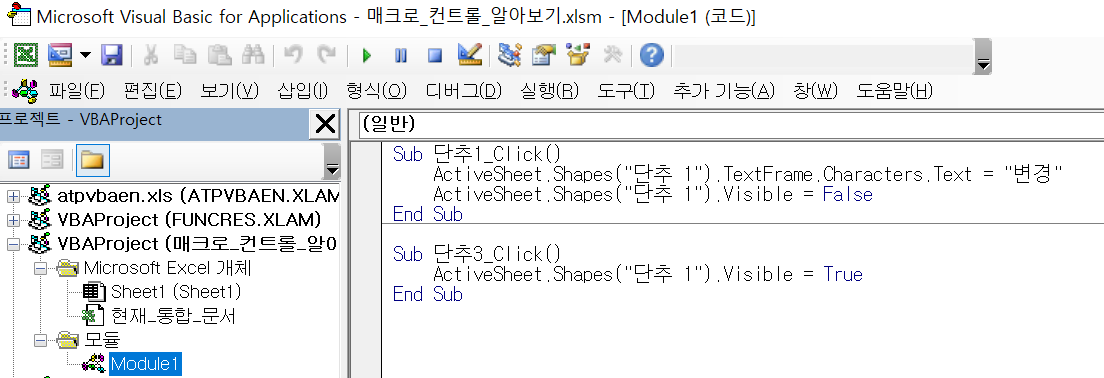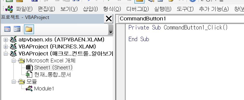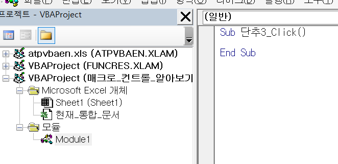 매크로 지정 후에 모듈이 자동으로 생기면서 모듈에 Sub 프로시저가 생기는 것을 알 수 있다.