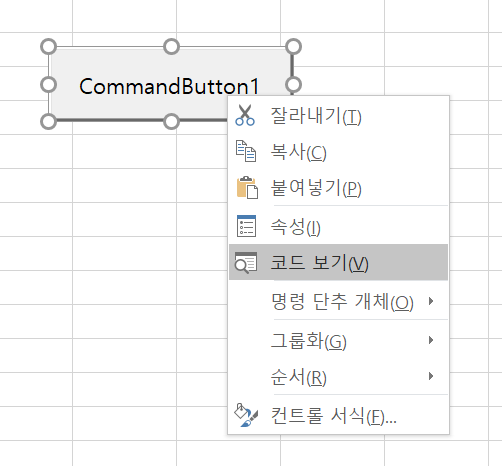 - 디자인모드>단추에서 마우스 우클릭>코드보기