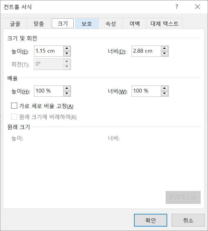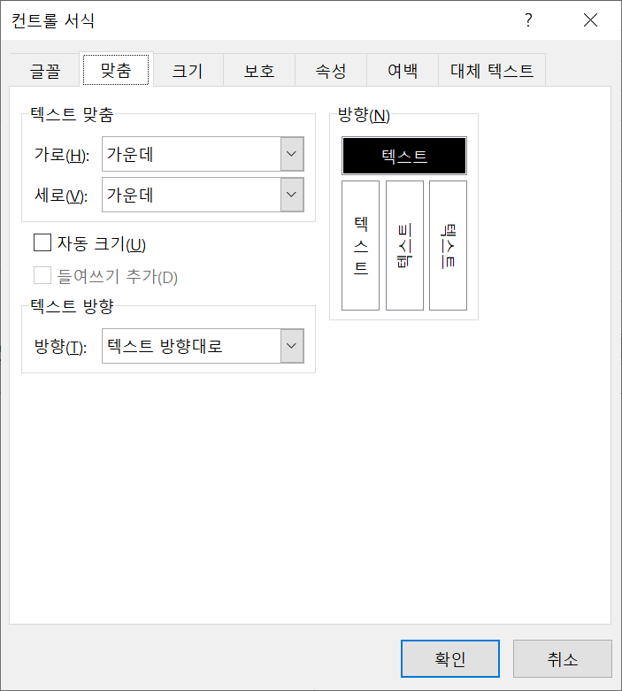 기본적으로 "단추"라는 이름이 Caption으로 부여되고, 양식 컨트롤의 추가순서에 따른 번호 1이 뒤에 부여된다.