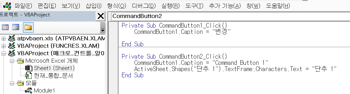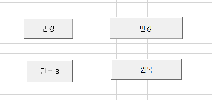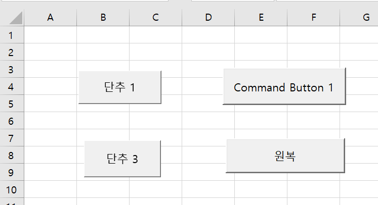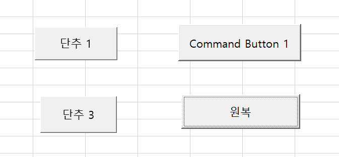 4) 원복 버튼을 클릭하면 단추1의 텍스트가 "단추 1"로 변경, 명령단추(Command Button 1)의 텍스트가 "Command Button 1"로 원복된다.