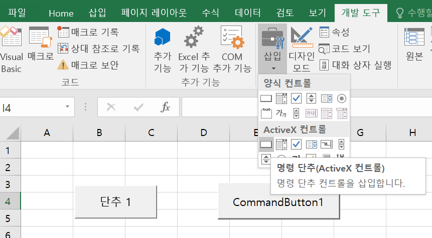 엑셀 폼 단추2개를 추가, ActiveX 명령 단추 2개를 추가한다.