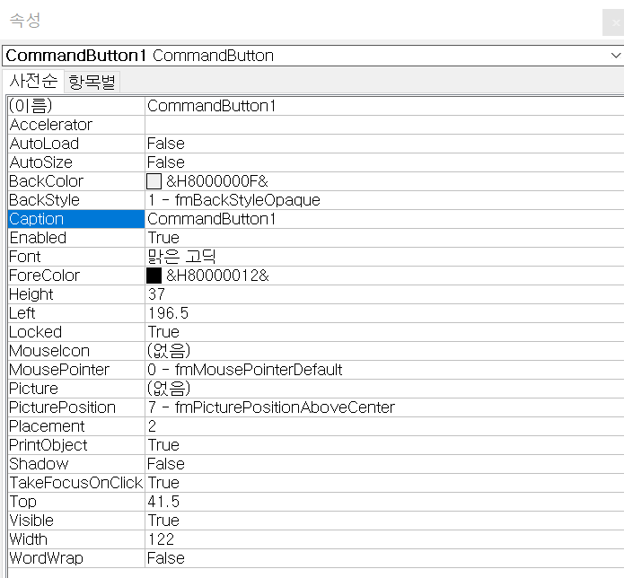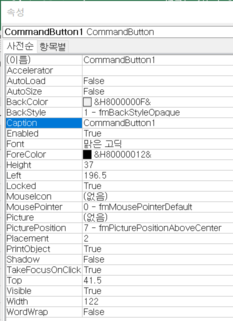 "CommandButton"이라는 이름이 Caption으로 부여되고, ActiveX 컨트롤의 추가순서에 따른 번호 1이 부여된다.