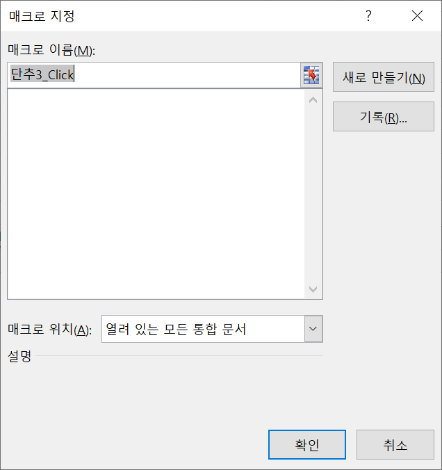 - 처음 단추를 추가하는 순간 매크로 지정 대화상자가 팝업될 때 지정