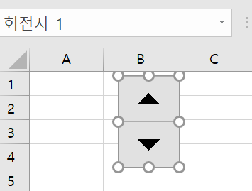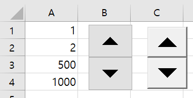 1234567Private Sub SpinButton1_SpinDown()ActiveSheet.Cells(3, 1).Value = ActiveSheet.Cells(3, 1).Value + 1End SubPrivate Sub SpinButton1_SpinUp()ActiveSheet.Cells(4, 1).Value = ActiveSheet.Cells(4, 1).Value + 1End Subcs 컨트롤을 누르다보면 아래 그림처럼 컨트롤의 기본값과는 상관없이 A3, A4의 값들이 증가하는 것을 알 수 있다.
