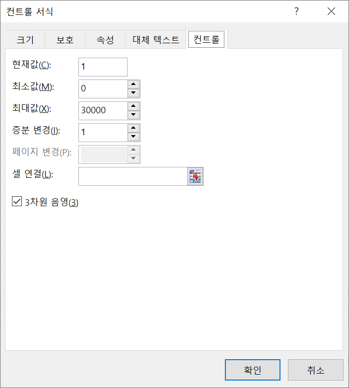 - 스핀단추(양식컨트롤)은 최소값0, 최대값 30000, 증분1로 설정한다.)