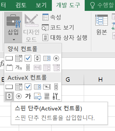 개발도구>삽입>양식 컨트롤>스핀 단추(양식컨트롤) 개발도구>삽입>ActiveX컨트롤>스핀 단추(ActiveX 컨트롤)