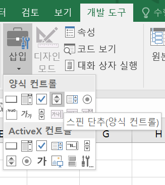 개발도구>삽입>양식 컨트롤>스핀 단추(양식컨트롤) 개발도구>삽입>ActiveX컨트롤>스핀 단추(ActiveX 컨트롤)