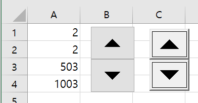 1234567Private Sub SpinButton1_SpinDown()ActiveSheet.Cells(3, 1).Value = ActiveSheet.Cells(3, 1).Value + 1End SubPrivate Sub SpinButton1_SpinUp()ActiveSheet.Cells(4, 1).Value = ActiveSheet.Cells(4, 1).Value + 1End Subcs 컨트롤을 누르다보면 아래 그림처럼 컨트롤의 기본값과는 상관없이 A3, A4의 값들이 증가하는 것을 알 수 있다.