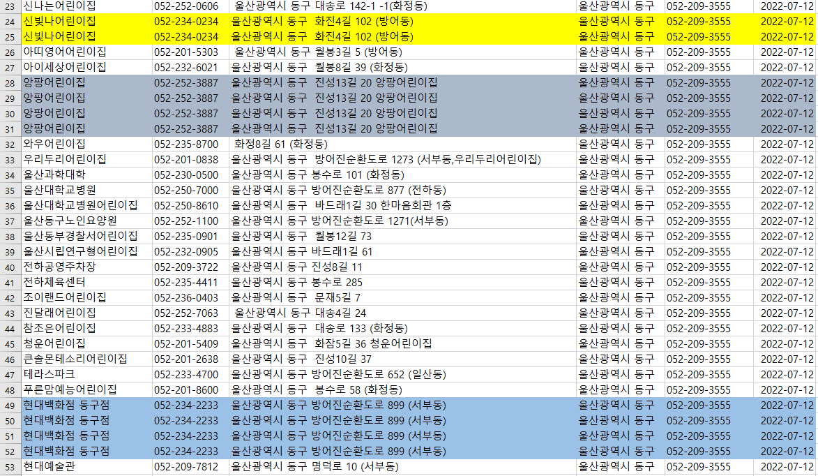 설명을 위해 다음과 같은 데이터를 준비했다. 공공 데이터 포탈에서 구한 자료이며, 울산광역시 동구 실내공기질 측정 대상에 대한 정보이다.
