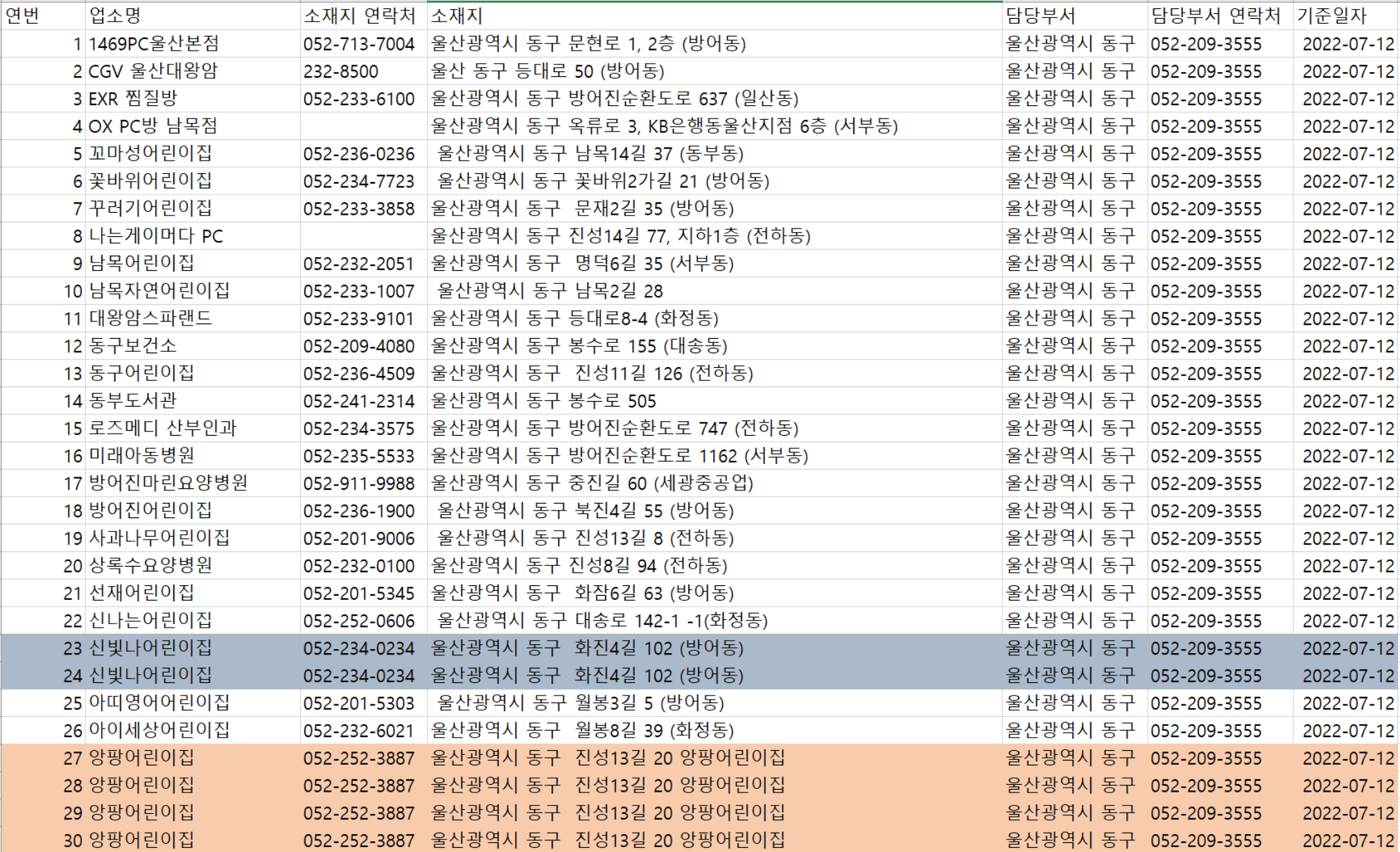 설명을 위해 다음과 같은 데이터를 준비했다. 공공 데이터 포탈에서 구한 자료이며, 울산광역시 동구 실내공기질 측정 대상에 대한 정보이다.