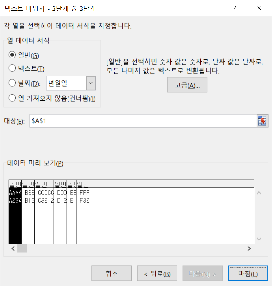 3단계에서는 나눈 데이터열에 대한 서식을 지정하는 것이 가능하다.