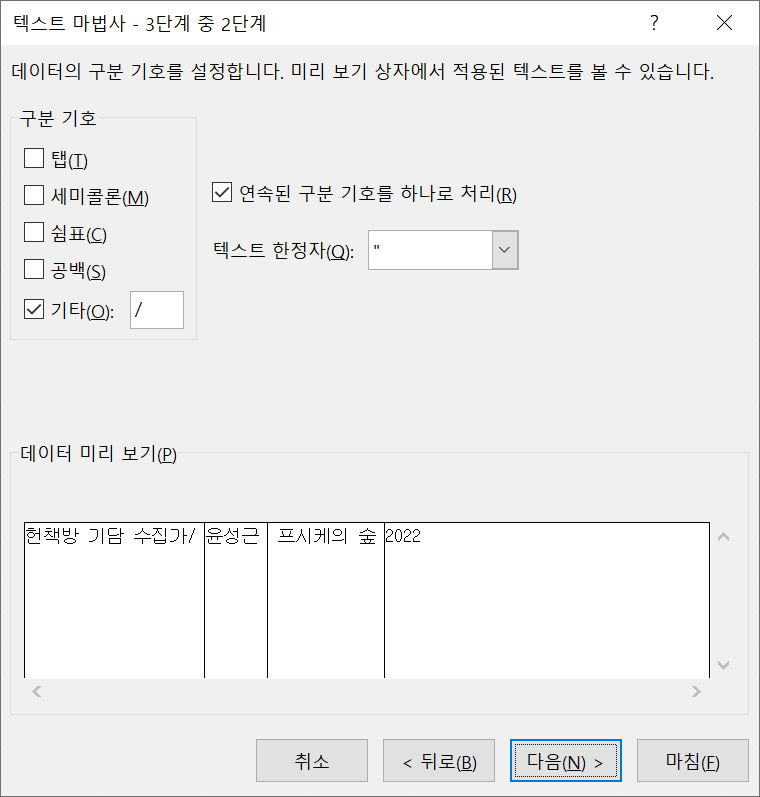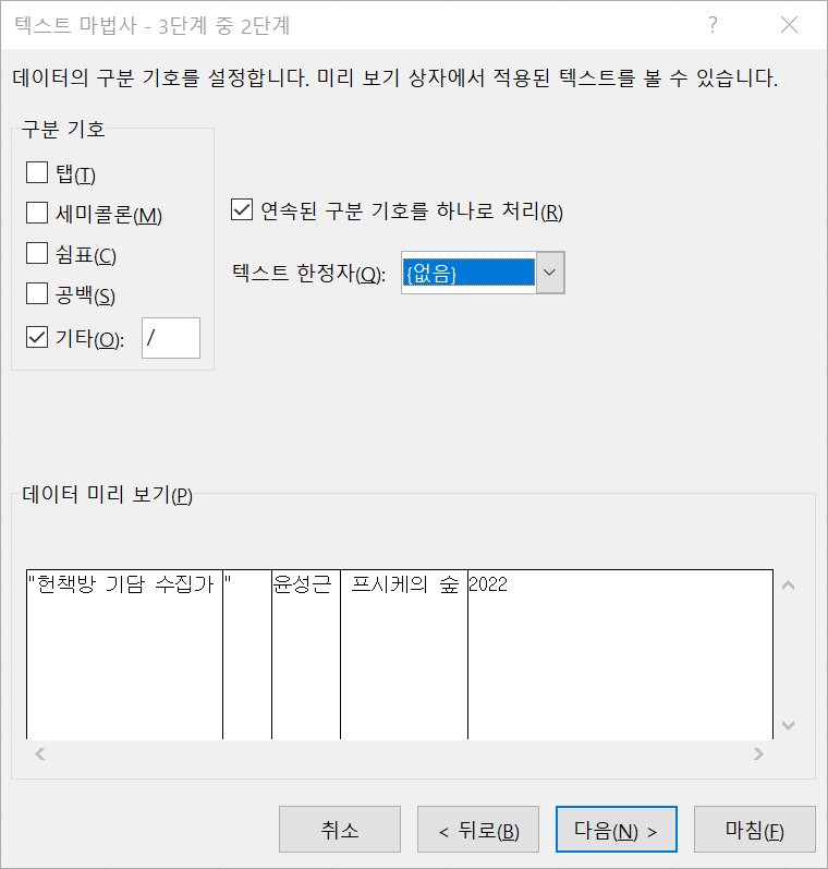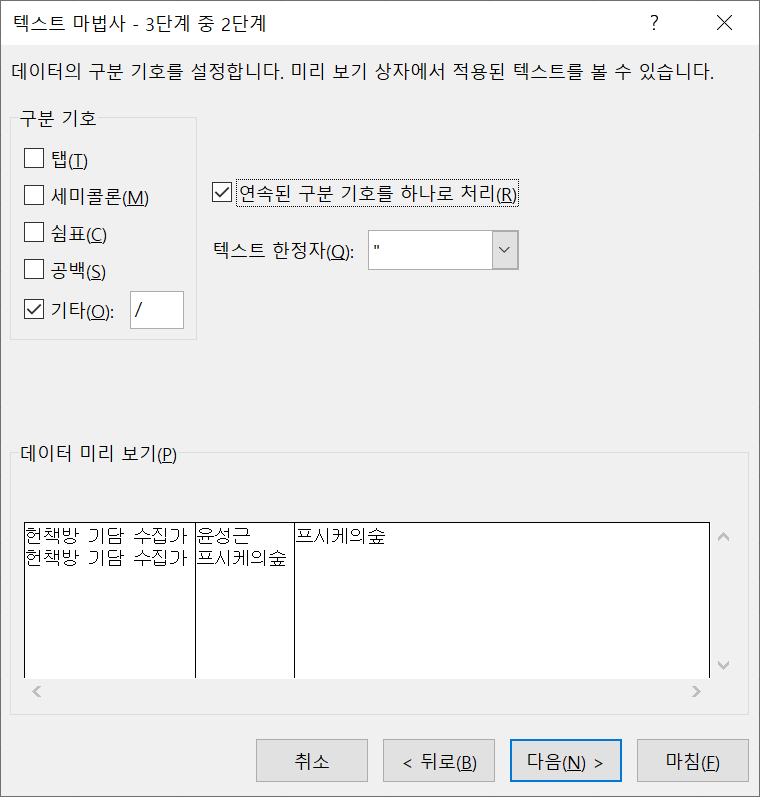 위의 데이터를 나누기한다고 생각해보자. 텍스트 한정자로 따옴표(")를 지정하면, 두개의 따옴표 사이에 존재하는 텍스트는 하나의 텍스트로 인식이 된다. 구분자(/)가 중간에 있어도 구분자로 인식하지 않는다.