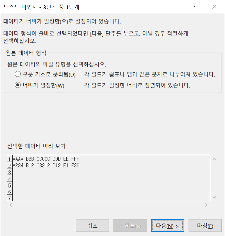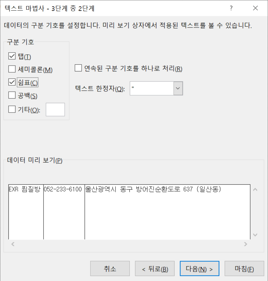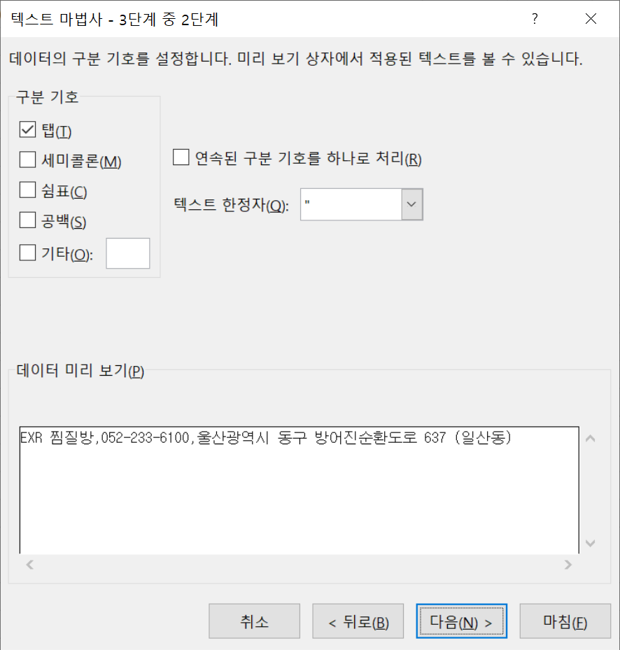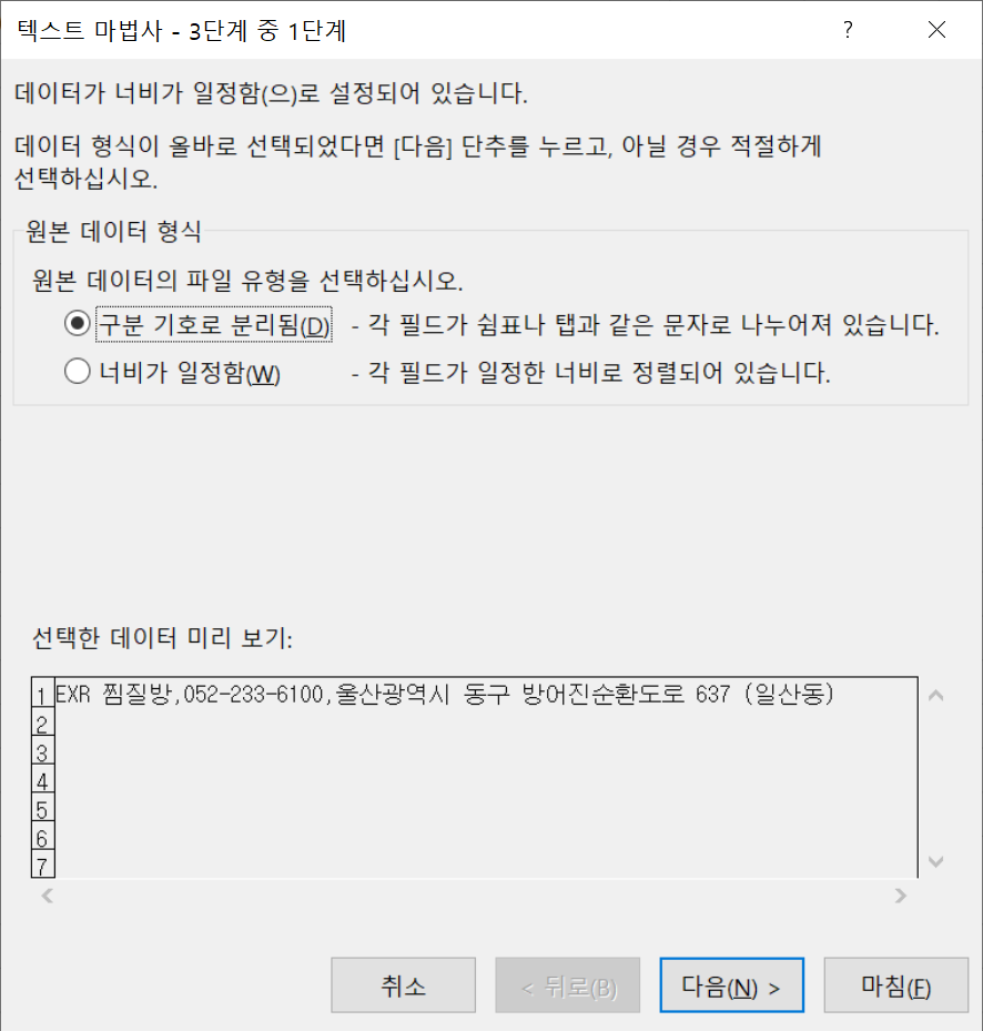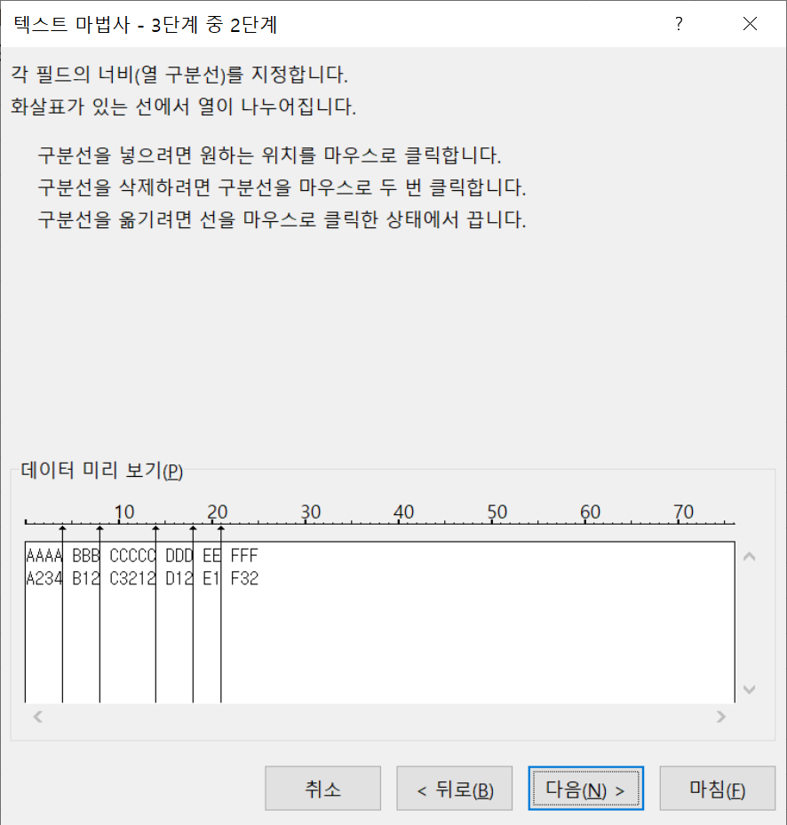 텍스트 나누기를 실행하면 다음과 같이 텍스트 마법사 창이 뜬다.