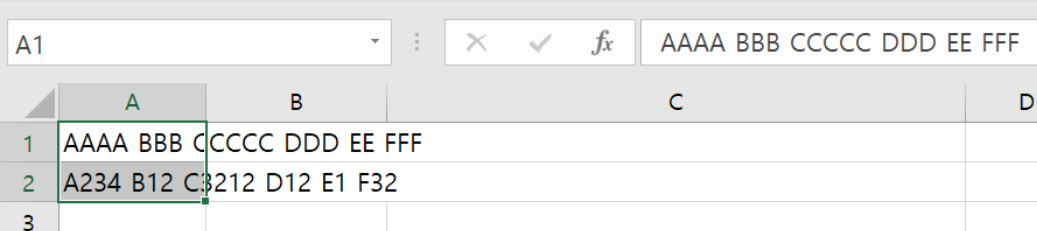 마침을 클릭하면 위의 그림과 같이 A1, B1, C1에 텍스트 나누기가 수행된 것을 확인할 수 있다.