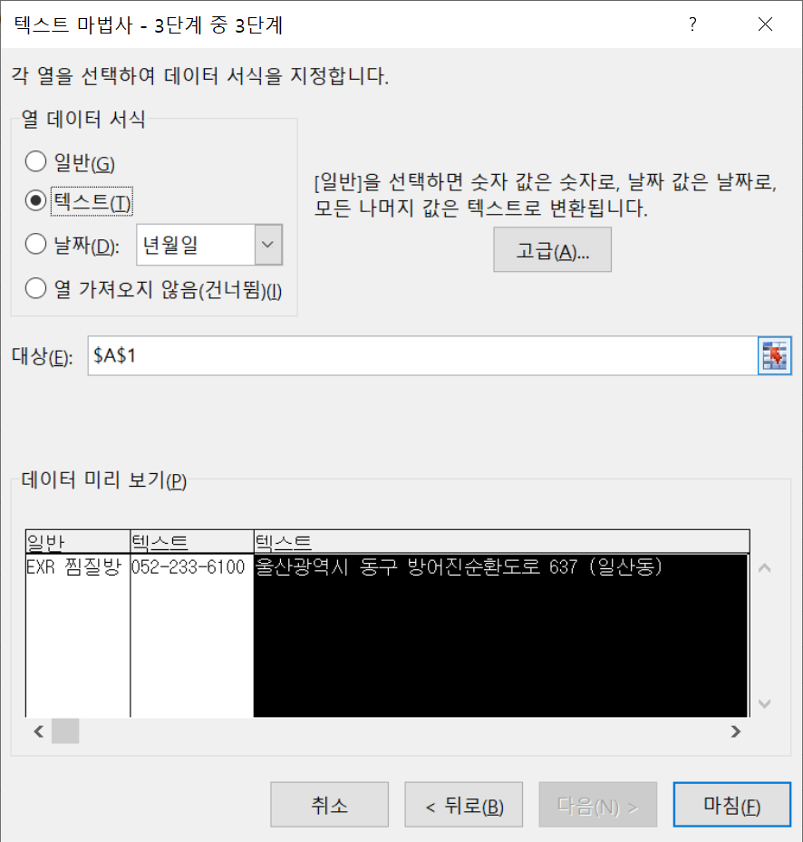 3단계에서는 위의 그림 처럼 각각의 열 데이터에 서식을 적용할 수 있다. 데이터 미리보기에서 열을 선택한 후 열 데이터 서식에 있는 데이터 서식을 지정하면 된다. 위의 그림은 업체명은 일반, 전화번호와 주소는 텍스트로 서식을 지정한 결과이다.