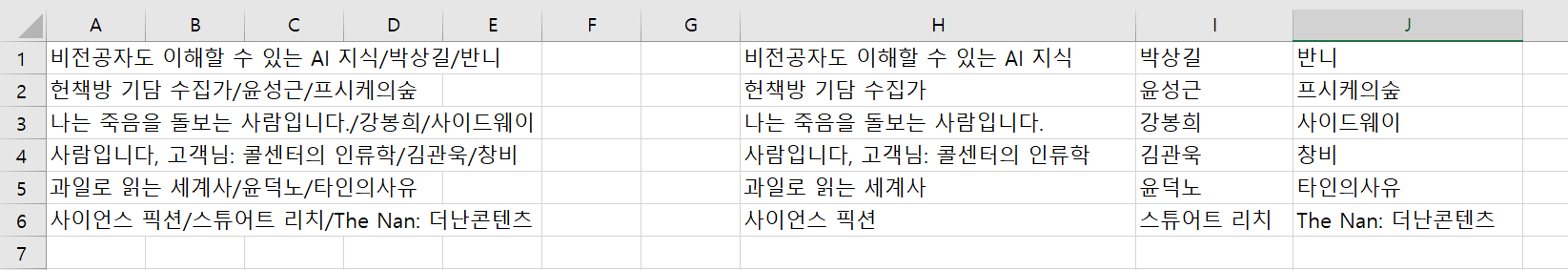 1234567891011121314151617181920Sub textToColumns_slash()'텍스트 나누기할 영역 저장을 위한 Range 변수 선언Dim section As Range'텍스트 나누기한 결과를 입력할 첫 셀 지정을 위한 변수 선언Dim startSection As Range'텍스트 나누기할 영역의 행 길이를 저장할 변수 선언Dim rowNum As Long'텍스트 나누기할 영역의 데이터가 몇행에 걸쳐 있는지 계산rowNum = ActiveSheet.Cells(Rows.Count, 1).End(xlUp).Row'데이터가 있는 영역 지정Set section = ActiveSheet.Range(Cells(1, 1), Cells(rowNum, 1))'텍스트 나누기한 결과가 저장될 영역 지정Set startSection = ActiveSheet.Range("H1")'데이터 영역 선택section.Select'선택한 영영에 대한 텍스트 나누기 실행, 구분기호(/)사용section.TextToColumns Destination:=startSection, Other:=True, OtherChar:="/", DataType:=xlDelimitedEnd Subcs 실행 결과는 다음과 같다.