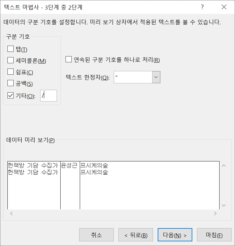 위의 데이터를 나누기한다고 생각해보자. 텍스트 한정자로 따옴표(")를 지정하면, 두개의 따옴표 사이에 존재하는 텍스트는 하나의 텍스트로 인식이 된다. 구분자(/)가 중간에 있어도 구분자로 인식하지 않는다.