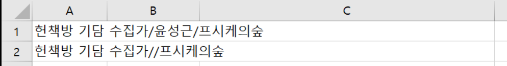마침을 클릭하면 위의 그림과 같이 A1, B1, C1에 텍스트 나누기가 수행된 것을 확인할 수 있다.