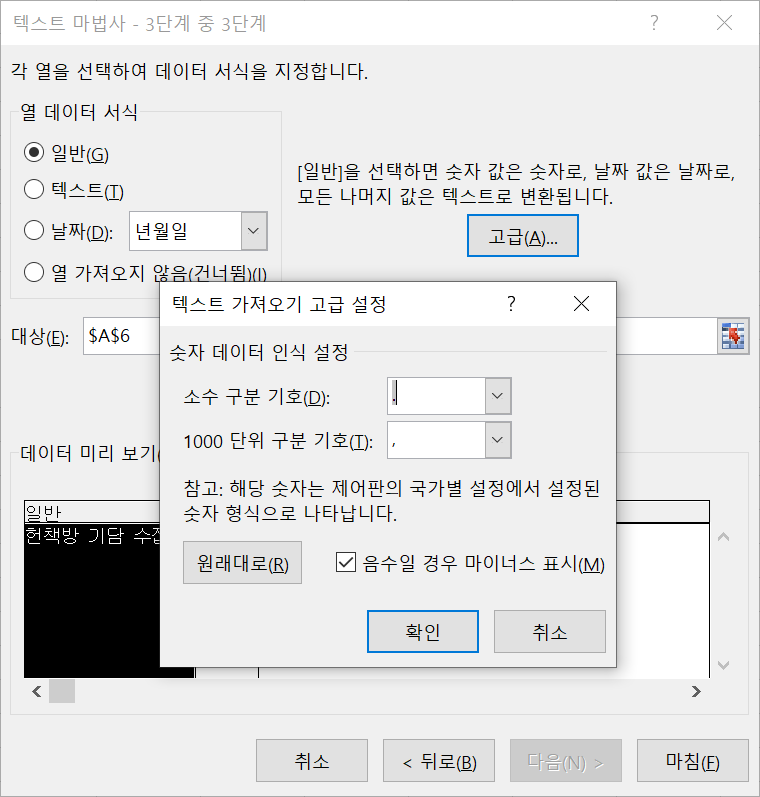 텍스트 가져오기 고급설정 (마법사3단계에서 열 데이터 서식을 일반으로 선택 한 후 고급 버튼 클릭)에서 소수 구분 단위(DecimalSeparator), 1000 단위 구분기호(ThousandsSeparator), 음수일 경우 마이너스 표기 여부(TrailingMinusNumbers)를 결정할 수 있다.