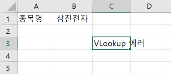 1234567891011121314151617181920212223242526272829Sub vlookupTestErrorHandling0()On Error GoTo Error01:Dim title As StringDim section As RangeDim code As String'B1 셀의 내용을 title에 저장한다.title = ActiveSheet.Cells(1, 2).Value'종목데이터 시트의 A1:AE823 영역을 range 객체에 할당한다.Set section = Worksheets("종목데이터").Range("A1:AE823")'VLookup함수를 실행한다. B1에 있는 데이터는 종목데이터 시트에서 찾아서'2번째 열의 데이터를 가져온다.code = Application.WorksheetFunction.VLookup(title, section, 2, False)'C3 셀의 서식을 텍스트로 변경한다.ActiveSheet.Cells(3, 3).NumberFormatLocal = "@"'VLookup함수의 결과값을 C3에 저장한다.ActiveSheet.Cells(3, 3).Value = codeExit SubError01:If code = "" ThenActiveSheet.Cells(3, 3).Value = "VLookup 에러"ElseActiveSheet.Cells(3, 3).Value = "미식별 에러"End IfEnd Subcs code에 아무값이 할당되지 않은경우 "VLookup 에러" 메시지를 C3셀에 출력한다.