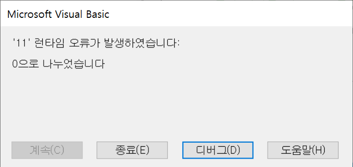 0으로 나누는 행위 자체가 오류이기 때문에 런타임 오류가 발생했다는 메시지와 함께 경고창이 팝업된다.