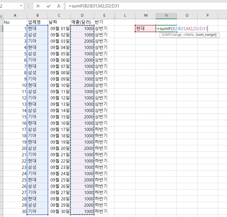 지정한 영역에서 기업명이 현대일 경우 매출을 더한 값을 표기한다.