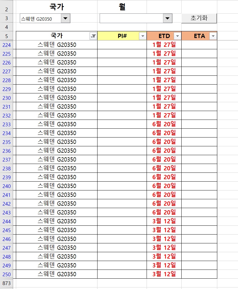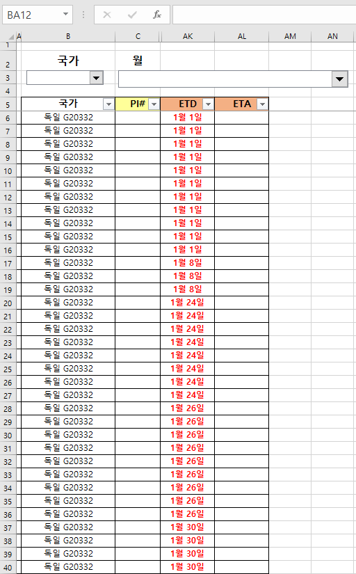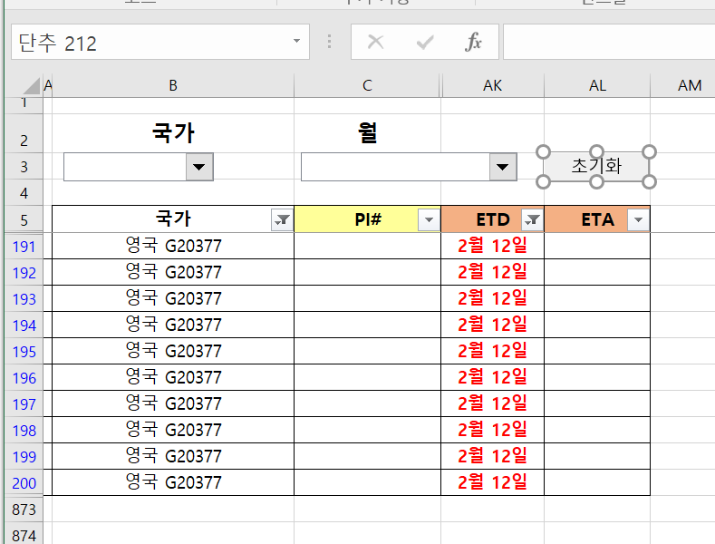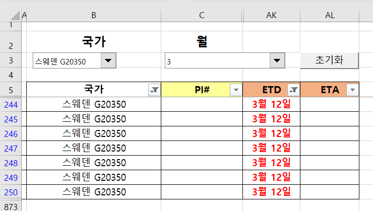4. 콤보박스 중에 월을 선택하면, 필터가 ETD열에서 해당월을 선택한 것으로 변경되어야 한다.