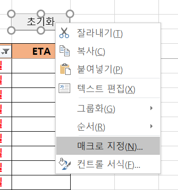 버튼은 엑셀 폼 컨트롤이므로 우클릭 후에 매크로 지정을 통해 이벤트 핸들러를 연결할 수 있다.