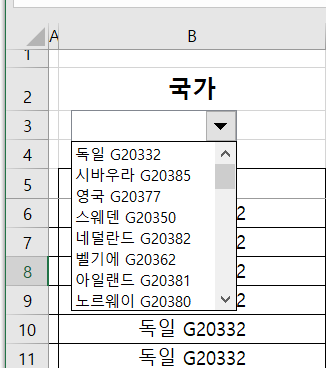 콤보 박스(국가)에는 B열에 있는 국가 정보를 중복되는 것은 제거한 상태로 담아야 한다.