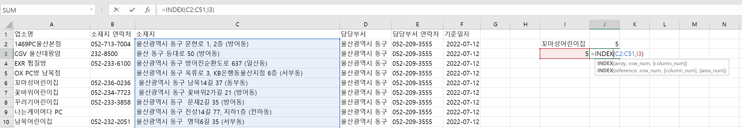 예를 들어 아래의 표에서 선재어린이집의 소재지 연락처를 검색하는 함수를 만들어보자