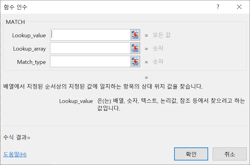 MATCH 함수의 인수(파라미터)는 다음과 같다.