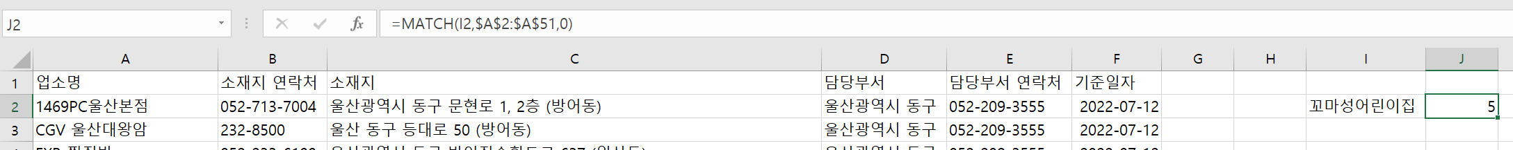두번째 인자로 지정한 영역에서 꼬마성어린이집의 위치는 5번째이므로 5가 출력될 것으로 예상된다.