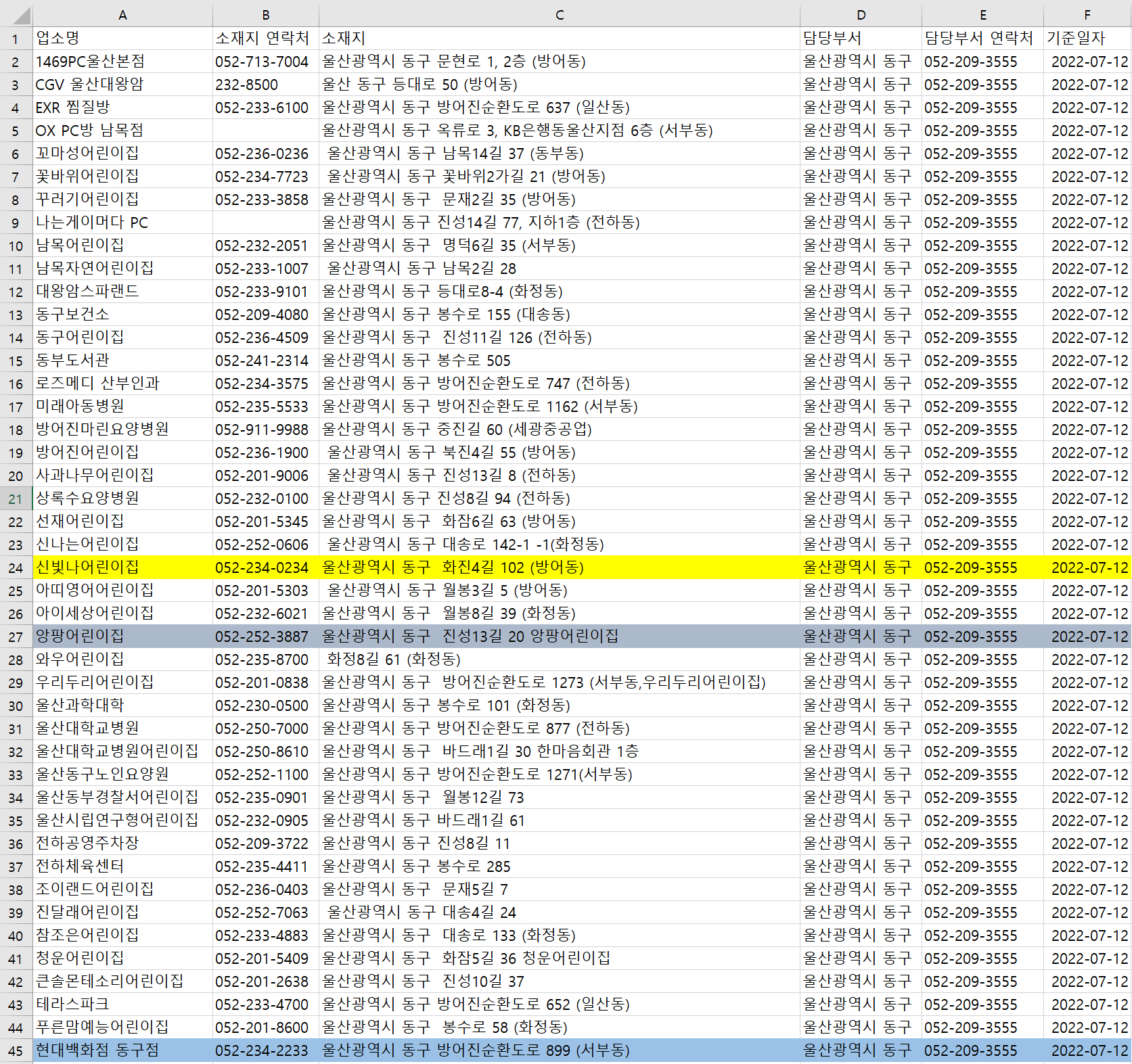 *참고로 아래의 데이터는 오픈데이터 포탈에서 얻을 수 있는 울산광역시 미세먼지 측정 대상 업체를 나타낸다.
