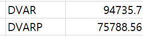 05. DVAR, DVARP함수아래의 두 함수는 분산을 구하는 함수인데, 분산을 구하려고하는 대상이 표본집단인지 모집단인지에 대한 차이가 있다.