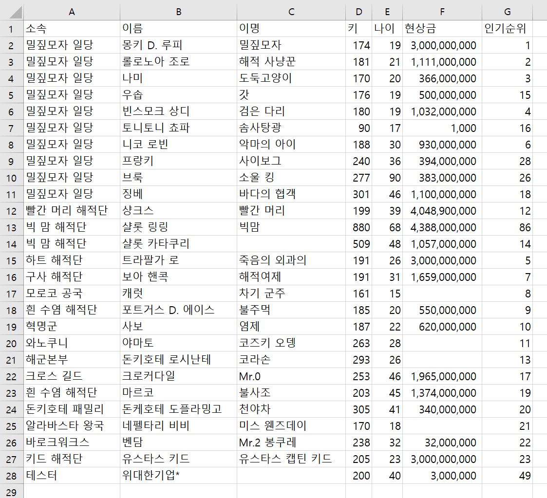 위의 예제는 소속이 밀짚모자 일당인 레코드의 이명을 가져오는 작업을 한다.