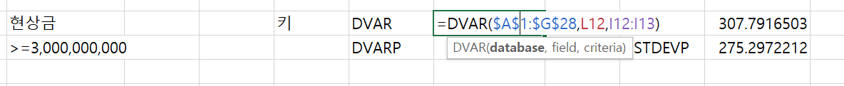06. DSTDEV, DSTDEVP 함수아래의 두 함수는 분산대신 표준편차일 뿐, DVAR, DVARP의 차이와 동일하다.