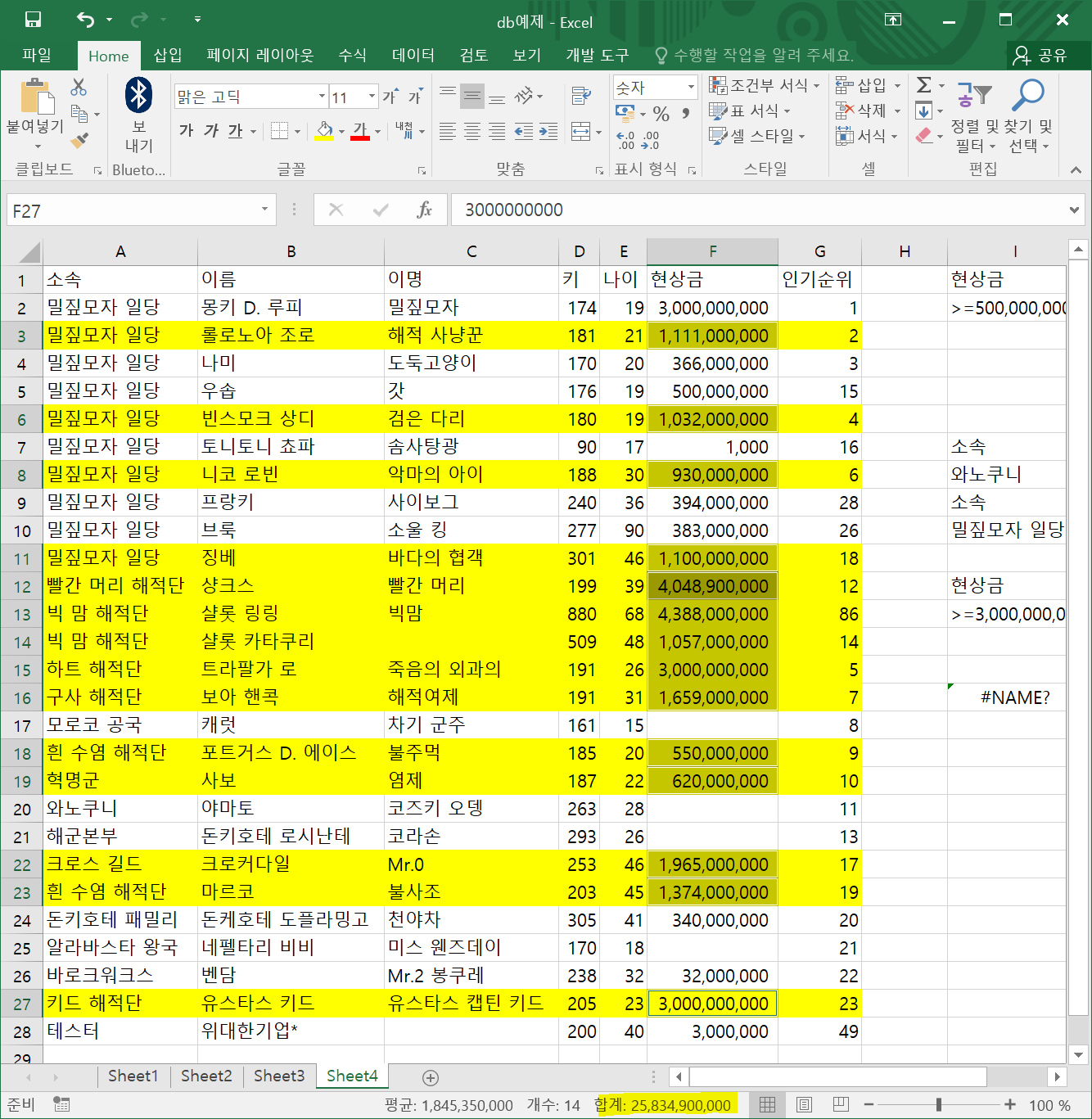 현상금 5억 이상이고 키 180이 이상인 레코드는 노란색으로 색칠한 레코드와 같다. 모두 숫자이므로 14가 출력될 것으로 예상된다.