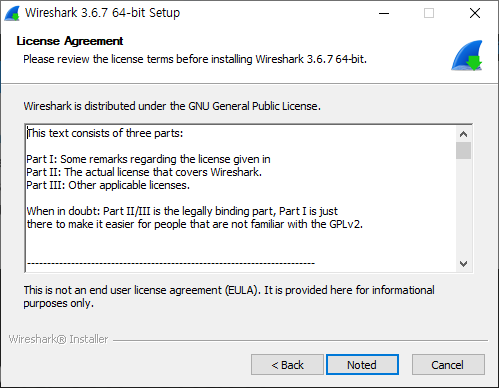 Wireshark 설치 (패킷 캡처 도구)컴퓨터 네트워크 2022. 8. 10. 20:48728x90본 블로그의 컴퓨터 네트워크 카테고리에서는 지금까지 전공으로 해온 컴퓨터 네트워크에 대한 전반적인 내용을 끄적여 보려한다. 컴퓨터 네트워크를 이해하는 방법 중 가장 좋은 방법은 패킷을 열어보고 그 안에 어떠 내용이 들어있는 지 살펴보는 것이라고 생각한다. 본 포스트에서는 패킷 캡처 도구 또는 패킷 스니퍼라고 불리는 툴 중에서 무료임에도 불구하고 상당한 성능을 자랑하는 Wireshark에 대해 다룬다. 포스트 목차. 01. 스니퍼의 역할 02. Wireshark 설치 방법 03. Wireshark의 기본적인 사용 방법 01. 스니퍼의 역할 패킷 스니퍼는 우리가 관심있어 하는 네트워크 인터페이스를 통해 흘러들어오는 패킷의 내용을 하나하나 살펴보는 기능을 제공한다. 여기서 네트워크 인터페이스는 쉽게 말해 랜카드를 뜻한다. 네트워크 인터페이스 중에는 Loopback (루프백) 인터페이스도 있는데 동일 머신내에 있는 프로세스가 소켓을 이용하여 통신할 때 사용하는 인터페이스를 뜻한다. 패킷 스니퍼는 루프팩 인터페이스를 포함하여 대부분의 네트워크 인터페이스를 통해 수신되고 송신되는 패킷의 정보를 읽어보는 기능을 제공한다. 무료로 제공하는 스니퍼 중에 가장 유명한 것은 Wireshark이다. 유로 스니퍼 중에서는 OmniPeek이 유명한 것 같다. 02. Wireshark 설치 방법 본 포스트에서는 윈도우 사용자를 대상으로 Wireshark 설치하는 법에 대해 다루고자 한다. 사실 설치는 간단하다. 다음 사이트에서 인스톨레이션 파일을 다운로드 후에 실행하면 된다. https://www.wireshark.org/#download Wireshark · Go Deep. What is SharkFest? SharkFest™, launched in 2008, is a series of annual educational conferences staged in various parts of the globe and focused on sharing knowledge, experience and best practices among the Wireshark® developer and user communities. Shar www.wireshark.org 사용하고자하는 OS에 맞는 파일을 다운로드 후에 설치를 진행하면 된다. 윈도우즈의 경우 설치형태가 아닌 포터블 파일도 있으니 취향에 맞게 다운로드 후 실행하면 된다.  포스트 작성 시점에서는 최신버전이 3.6.7인것으로 파악된다. 윈도우즈 인스톨러 버전을 다운받아서 실행하면된다.  라이센스 관련 화면 (Noted 클릭)  설치할 컴포넌트 과련화면 (기본 값으로 설치)  아이콘 및 확장자 관련 파일 연결 관련(기본값으로 설치)  설치 경로 결정 (본인이 원하는 경로로 설정)  USB 관련 캡처 기능 (본인이 원할 경우 클릭)  설치 진행 과정  설치 완료 화면 03. Wireshark의 기본적인 사용 방법 일단 실행하면 다음과 같은 화면이 나온다.  컴퓨터의 설정에 따라 여러개의 네트워크 인터페이스가 나오는데, 우리가 관심있게 지켜보고 싶은것은 이더넷이다. 이더넷은 직접 인터넷과 연결되어 있는 물리적인 인터페이스이기 때문에 해당 인터페이스를 먼저 살펴보도록 하자. 이더넷을 선택 후에 왼쪽에 있는 상어 꼬리 모양의 아이콘을 클릭하면 캡처가 시작된다.  우리가 선택한 네트워크 인터페이스로 유입되는 모든 패킷이 표기 되기 때문에 환경에 따라 캡처되는 패킷이 많을 수도 있고 적을 수 도 있다. 기본적으로 다음과 같은 화면이 나올 것이다.  - 위의 화면은 크게 세가지 세부 영역으로 나눌 수 있다. 1) 캡처된 패킷 리스트 2) 선택한 패킷의 해석 정보 3) 선택한 패킷의 이진(헥사)정보  캡처된 패킷 리스트 중에서 우리가 관심있는 패킷을 선탟하면, 밑에 있는 두 개의 창에 해당 패킷을 구성하고 있는 데이터에 대한 자세한 정보가 나온다. 이것으로 패킷 분석 도구, 패킷 스니퍼, 패킷 캡처 도구인 Wireshark 의 설치 방법과 가장 기본적인 사용 방법을 알아봤다. 다음 포스팅부터는 네트워크 기본 개념에 대해 소개하고, 패킷 캡처가 필요한 상황이 발생 할 경우 Wireshark를 이용하여, 패킷 캡처를 수행하고, 해당 내용을 자세하게 분석할 예정이다. 728x90'컴퓨터 네트워크' 카테고리의 다른 글Wireshark TCP Stream 확인하기 (TCP 스트림 확인) (0) 2022.10.05 Wireshark 필터 사용법 (0) 2022.08.14