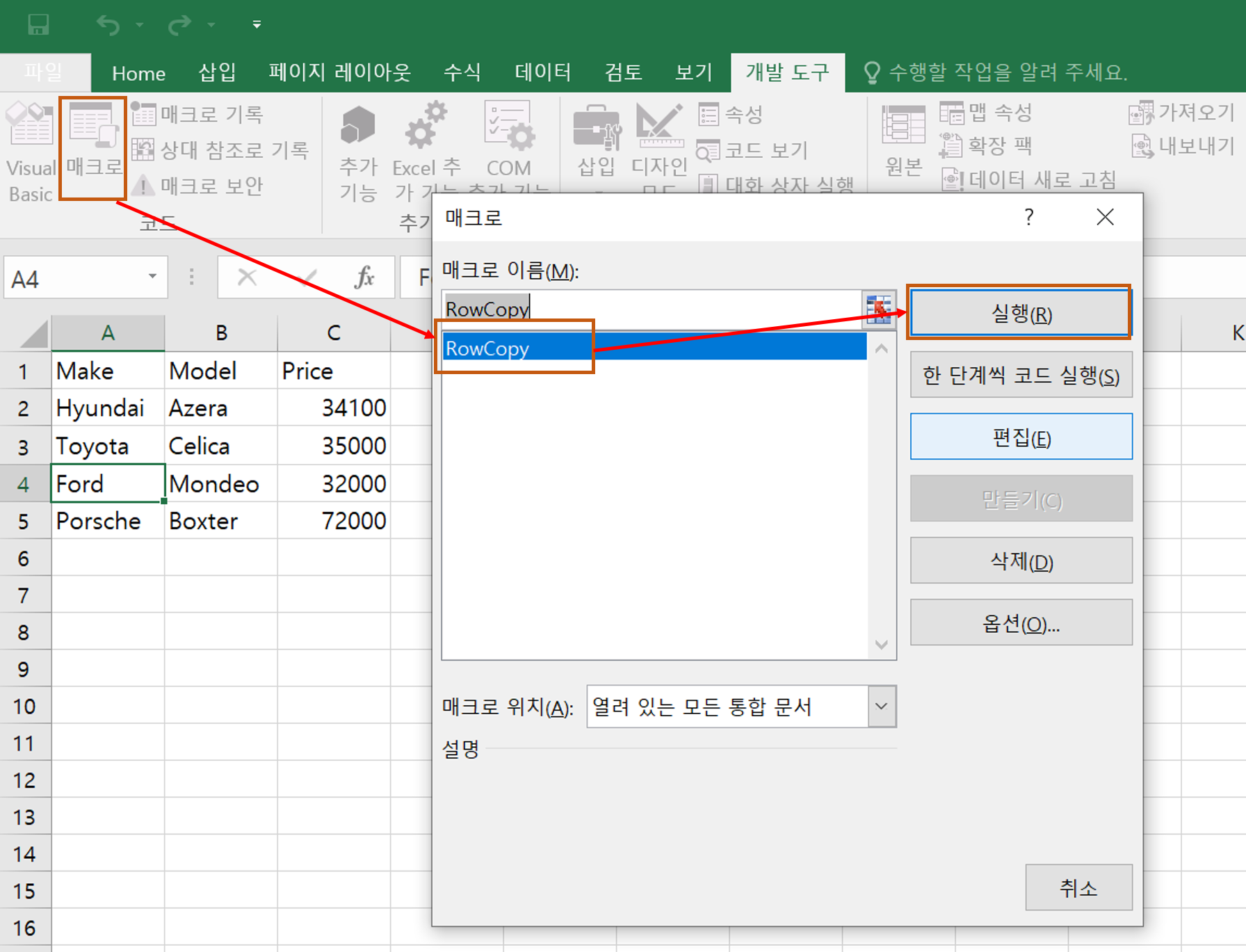 매크로 리스트중에 RowCopy를 선택하여 실행을 누른다.