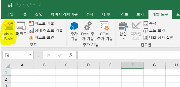 - 엑셀의 메인 화면으로 돌아가서 개발도구 메뉴가 보이면 성공이다. 왼쪽의 Visual Basic을 클릭하면 편집기를 실행 할 수 있다.