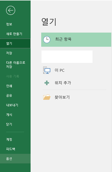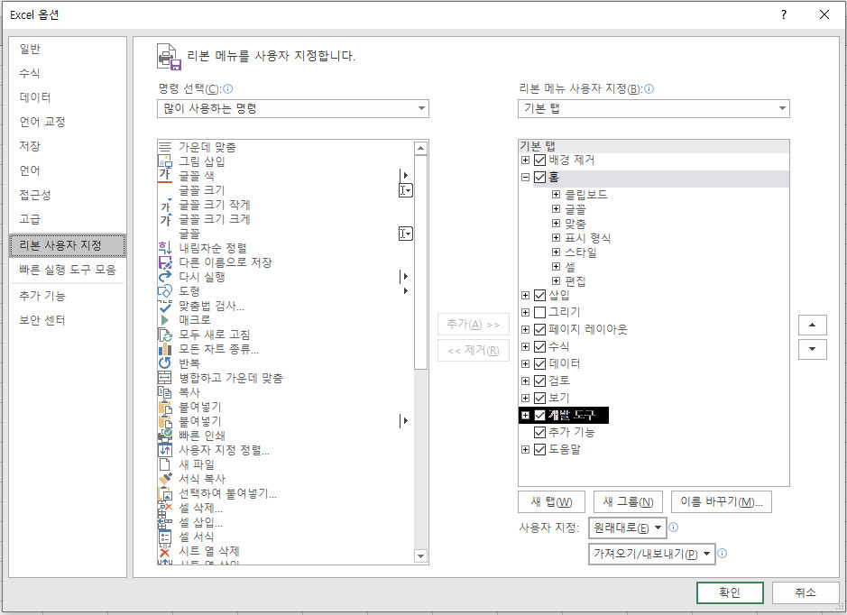 엑셀의 파일 메뉴를 클릭하면 위와 같은 세부 메뉴에 접근할 수 있다. - Excel 옵션 메뉴에 진입 후에 리본 사용자 지정 메뉴를 클릭한다. 오른쪽에 있는 개발도구 앞의 체크박스를 클릭하여 개발도구를 활성화 한다.