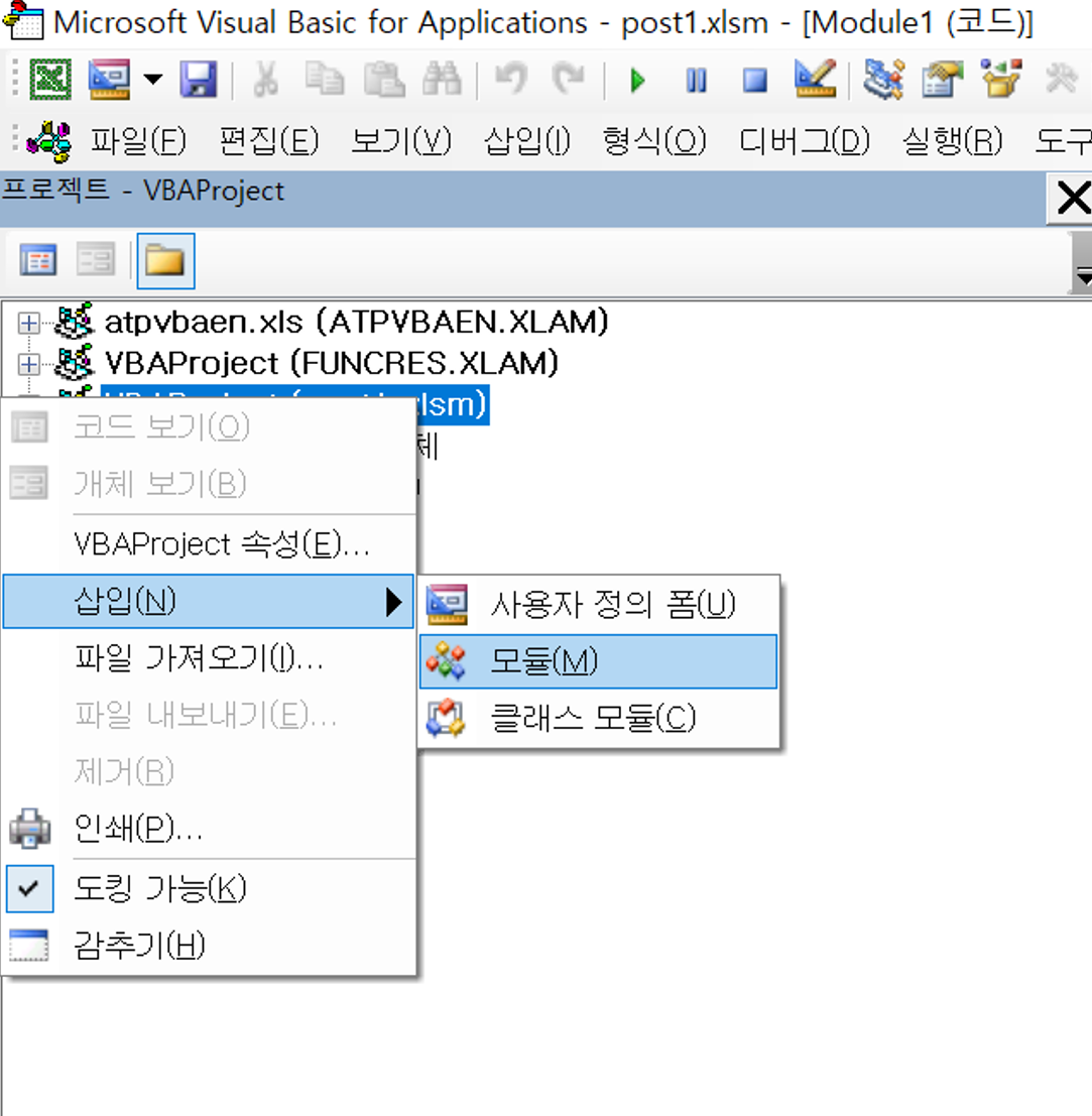 04. 코드 설명 및 실행 결과이제 Visual Basic 편집기를 실행하고, 현재 작업 중인 파일(프로젝트를 선택 후 오른쪽 클릭을 하여 모듈을 삽입한다)