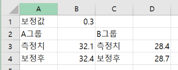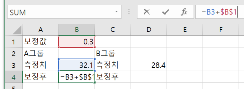 셀 B2에 보정값이라는 공통값을 입력해두고, 셀 B4와 셀 D4에 적용할 일이 있다고 하면, B2를 행과열 모두 절대주소로 지정하면 편한다.