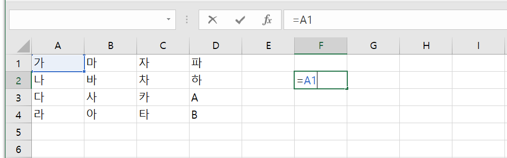 F2에 수식 =A1 입력 셀 F2에 "=A1" 이라는 수식을 입력하면 A1에 있는 "가"라는 문자가 F열에 출력될 것이다. 이 상황에서 F2셀을 복사한 후에