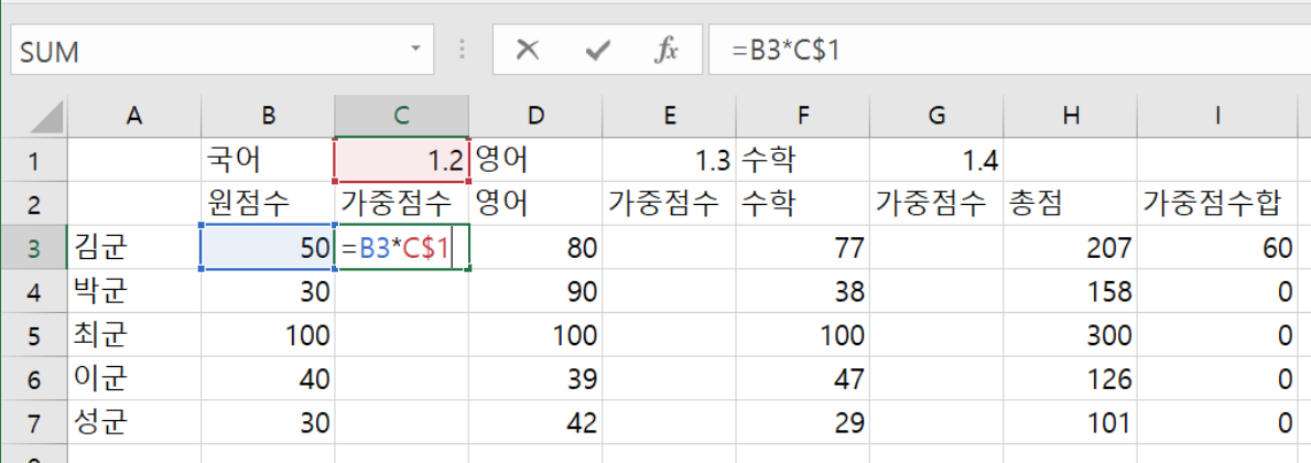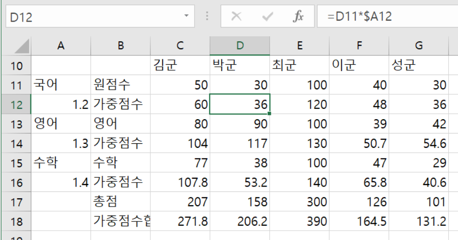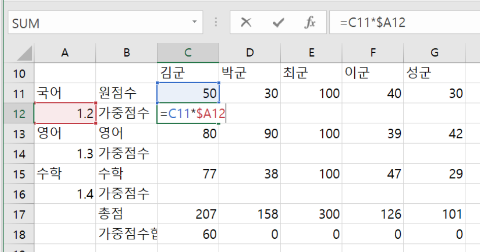 또한 이 값을 영어의 가중점수인 셀 C14에 복사하면, C13*$A14가 적용될 것이다.