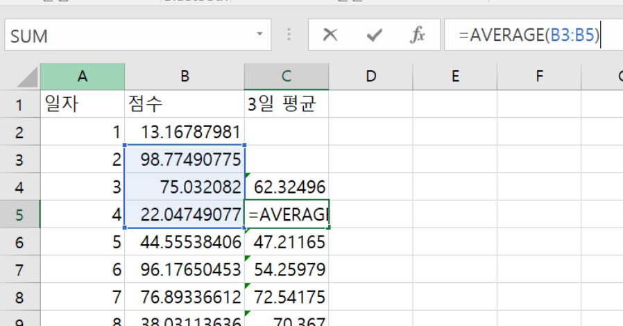 셀C4에는 B2:B4의 3일 간의 점수에 대한 평균이 들어간다.