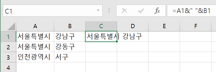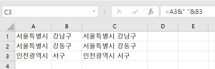 셀C1에 =A1&" "&B1을 사용하여 텍스트를 합치는 연산을 해보자. 결과는 서울특별시, 공백, 강남구가 합쳐져서 "서울특별시 강남구"가 되었다. 이 내용을 채우기 핸들이나 복사와 붙여넣기를 활용하여 C2:C3에 적용해보자.