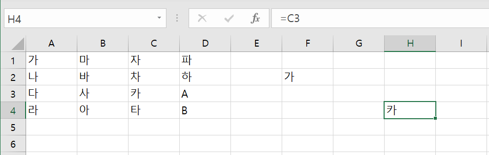 F2를 H4에 복사하여 붙여넣기할 예정 셀H4는 F2에서 2열 증가, 2행 증가된 주소를 갖는다. 따라서 수식의 내용인 =A1 또한 2열 증가, 2행 증가되어 =C3으로 변하게 될 것이다. 따라서 H4에는 수식 =C3이 들어가고 문자열 "카"가 출력될 것이다.