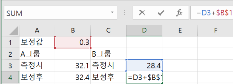셀 B2에 보정값이라는 공통값을 입력해두고, 셀 B4와 셀 D4에 적용할 일이 있다고 하면, B2를 행과열 모두 절대주소로 지정하면 편한다.